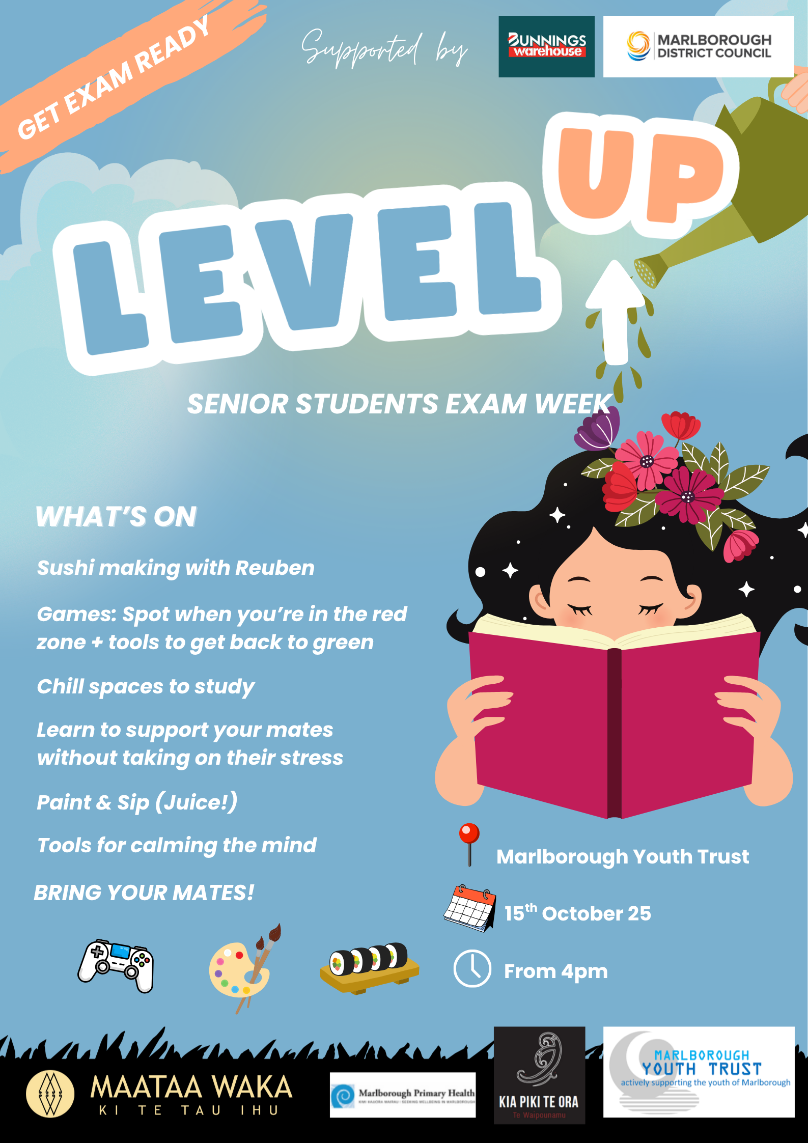 Senior students come along and get exam ready with us! We’ll have chill spaces for study, delicious kai, games, tools for calming the mind, and more!